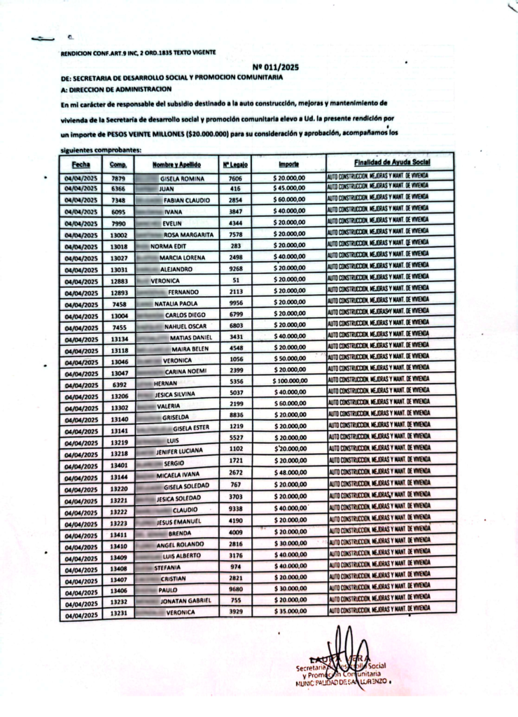 La rendición de gastos Nº 011/2025, emitida por la Secretaría de Desarrollo Social y Promoción Comunitaria, enumera transferencias realizadas entre el 4 y el 9 de abril. El patrón se repite: pagos idénticos de $20.000, $40.000 y hasta $100.000, otorgados con discrecionalidad, sin planificación, sin auditoría, sin control. Y, sobre todo, sin impacto real en el drama habitacional que vive San Lorenzo.