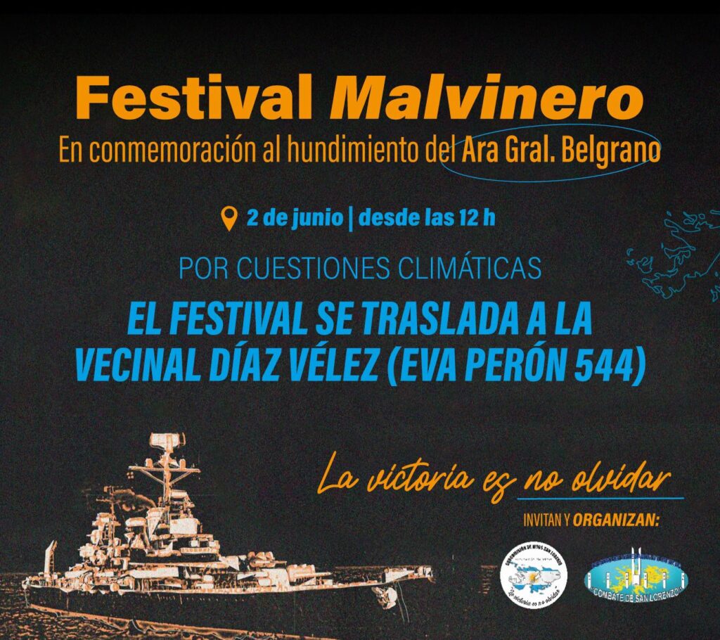 A partir de las 12:00 horas del próximo domingo dos de junio, hasta las 17:00, en la vecinal Diaz Vélez ubicada en calle Eva Perón al 544, se llevará a cabo el Festival Malvinero en conmemoración al hundimiento del ARA General Belgrano el día 2 de mayo de 1982. El festival estaba programado para realizarse durante la primera semana de este mes, pero debió ser postergado por malas condiciones climáticas.