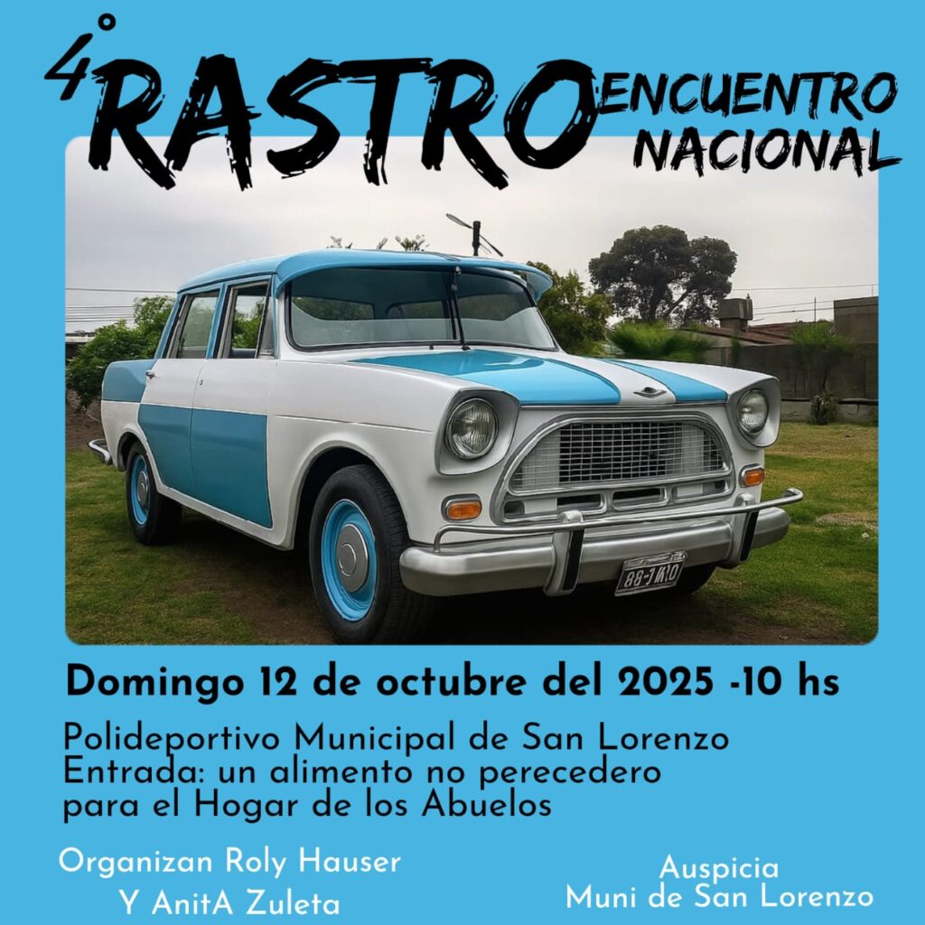Este próximo domingo 12 de octubre, a partir de las 10 hs, el Polideportivo Municipal de San Lorenzo será sede de la cuarta edición del Rastro Encuentro Nacional de Autos Clásicos, un evento que cada año reúne a coleccionistas, restauradores y aficionados del automovilismo histórico de distintas provincias del paÃs. La propuesta, que crece edición tras edición, busca promover la conservación del patrimonio automotor y ofrecer un espacio de encuentro para toda la familia.