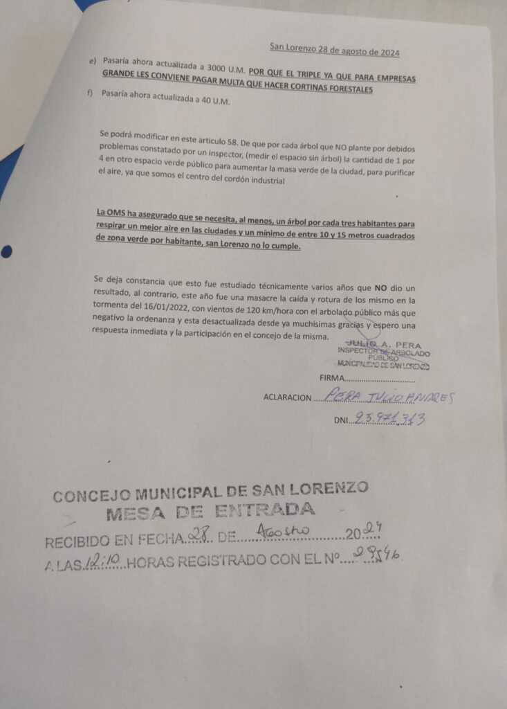 Julio Pera es un empleado municipal de San Lorenzo vinculado a tareas de mantenimiento del arbolado público. Ingresó una nota en el Concejo Municipal que fue tratada en una de las últimas reuniones de la Comisión de Obras Públicas en la que solicita una modificación a una ordenanza y cuestiona las acciones del gobierno de la ciudad en materia medioambiental.