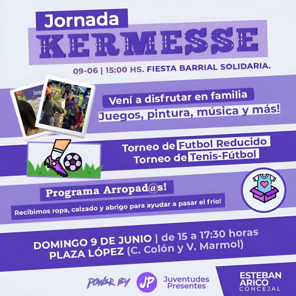 El próximo domingo 9 de junio a partir de las 15 horas, la agrupación Juventudes Presentes realizará una kermesse en la Plaza López, ubicada en calle Colón y V. Mármol, donde se llevarán a cabo actividades recreativas, con el fin de recolectar ropa, calzado y abrigo para aquellos que lo necesiten ante la llegada del invierno.