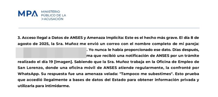 Extracto de la denuncia de acoso y utilización ilegal de datos de ANSES